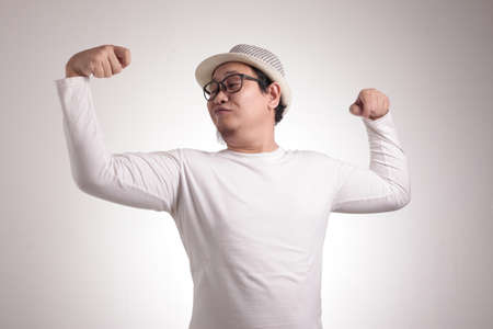 Asian men wear eyeglasses and white t-shirts. showing the muscles of his arms on a white background.