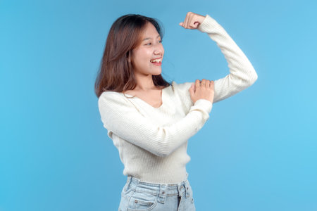 An Indonesian woman smiling as she flexes her arm in a cheerful and confident pose, wearing a sweater and jeans against a bright blue background.