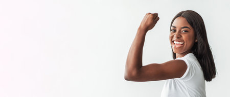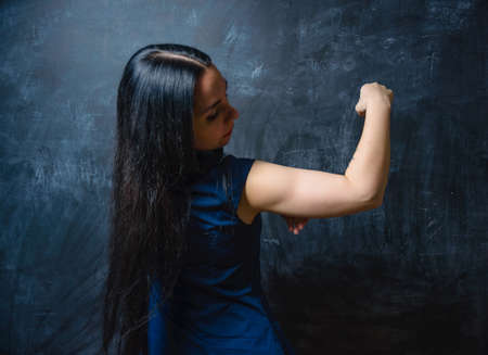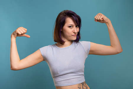 Portrait of pretty feminist woman shows her muscular arms proud from girl power and ready to face any challenges. strong lady fight with confident. Shows strength with raised hand, gray background