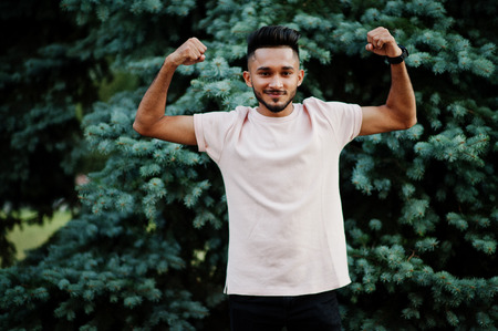 Stylish indian beard man shows his muscle hand. India model posed at green garden of city.