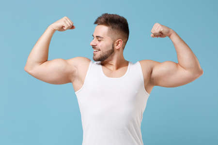 Smiling young bearded guy 20s in white singlet posing isolated on pastel blue wall background studio portrait. Sport fitness healthy lifestyle concept. Mock up copy space. Showing biceps, muscles.