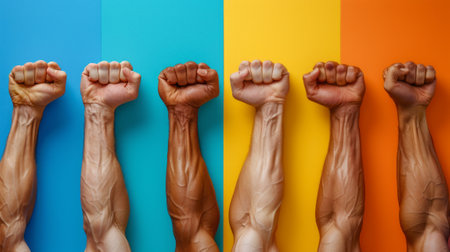 Colorful collage with muscular diverse male athletes hands raised with clenched fists. Fitness, healthy lifestyle, bodybuilding and diversity concept. Poster painted with rainbow colors.