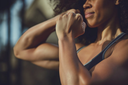 A close up shot of a man's muscular arms, with his biceps flexed and fists clenched, showcasing strength and determination.