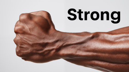 A close-up view of a muscular arm flexing a powerful fist against a dark, textured background. The image captures strength and determination, perfect for fitness themes.