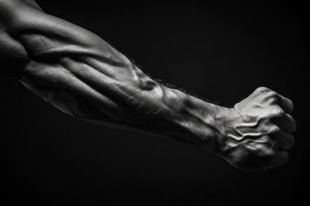 Monochrome close-up of a flexed muscular arm, showing strength, definition, and dedication to powerlifting or bodybuilding.
