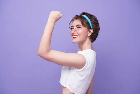 Strong young beautiful woman standing with hand rise up isolated on purple background. woman powerful concept.