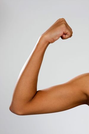 Will power success achievement goal win winner triumph victory best lifting development concept. Side profile close up photo of sporty big huge large muscle isolated on gray background copy space