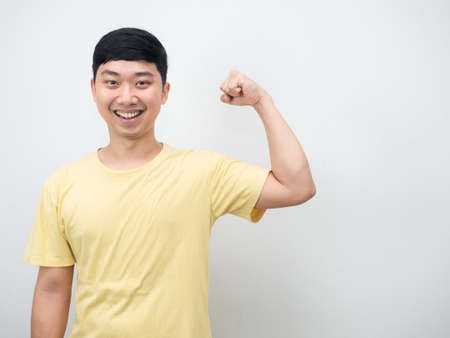 Portrait of funny narcissictic Asian man smiling proudly while showing double biceps pose, strength over confidence concept