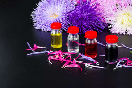 Glass bottles of essential oil with fresh flowers on black background. Studio Photo