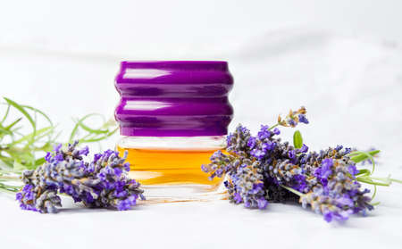 Lavender perfume and flowers on white silk fabric