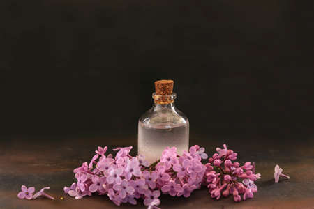 Lilac flower and lilac oil in bottle on wooden table