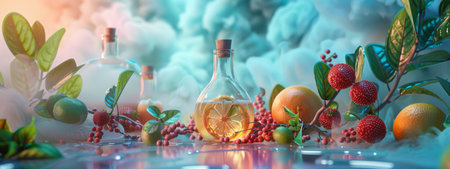 An artistic display of fruits and herbs set in a dreamy, misty environment. The ethereal light and vibrant colors create a magical and enchanting atmosphere, perfect for imaginative themes.