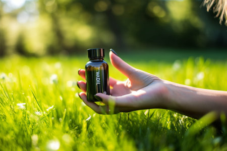 Woman holding a bottle with natural skincare product. Cosmetic and beauty concept. Blank dark bottle. Close up with a product and female hands.