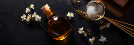 Banner. Bottle with cosmetic oil or essential aroma oil. Aromatherapy and massage. Health and medicine concept, beauty and selfcare. Top view, copy space