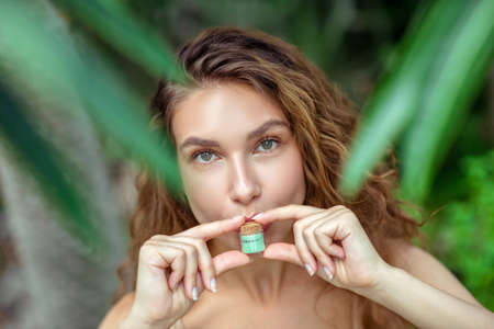 Organic cosmetics. Pretty young woman holding jar with eyeshadows