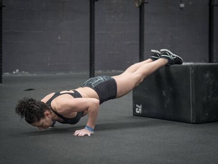 Slim beautiful athletic woman doing planking exercise in the stadium