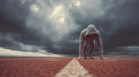 A lone runner crouches at the starting line on a track as dark clouds loom overhead signaling an approaching storm and creating a moment of suspense.