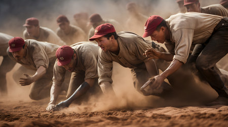 Team of professional workers playing baseball game on a dusty field. Selective focus.