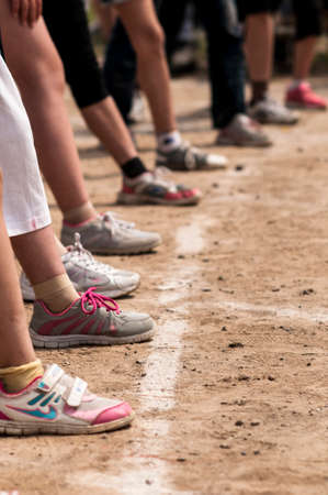 Image of spiked shoes at the start line of the track. Running concept. Mixed media
