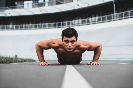Young sportive man in plank position on elbows with concentrating face at the stadium.