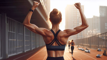 Athlete focusing on her run in a park during sunset with a determined expression and toned physique