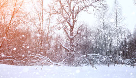 Winter forest and falling snowflakes. Beautiful winter landscape with snowfall