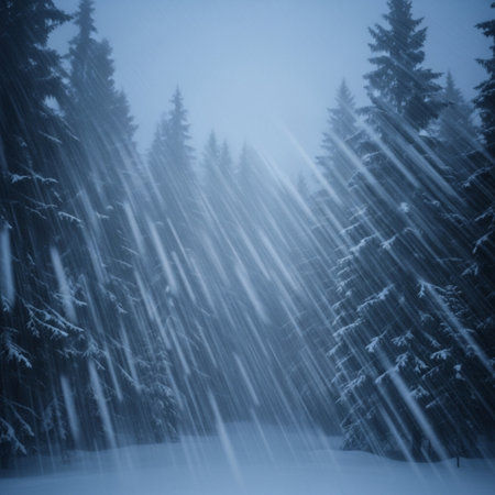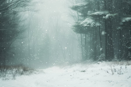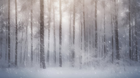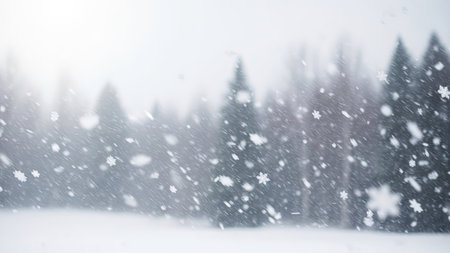 Blurred snowy pine forest with falling snowflakes, capturing the quiet beauty of winter's natural landscape