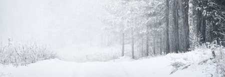 the background of a winter forest, a landscape of fir trees strewn with white snow, an empty road among deep snowdrifts in a blizzard