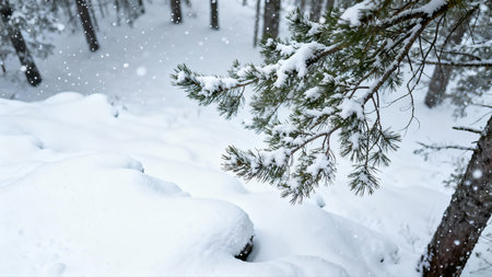 snow-covered pine branches, showing the intricate details of frost and snow crystals. The natural beauty of winter is highlighted in this image