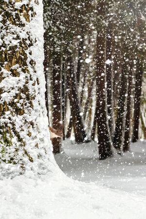 One red squirrel on the tree in park, during snowfall in winter season