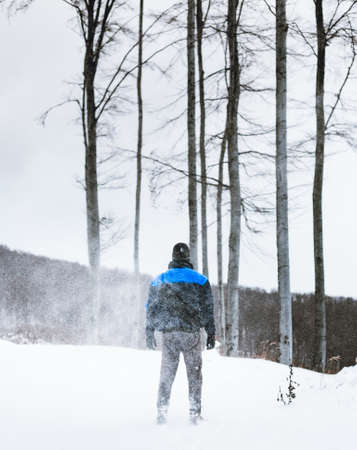 Climber (hiker) is going for the top of a mountain in an extreme blizzard. Snow storm in forest with snow covered terrain. Adventurer (photographer) walking through the forest in heavy conditions.