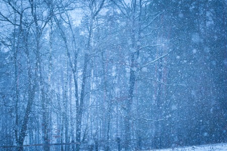 Flying snow with forest trees on background. Bad visibility snowy weather.