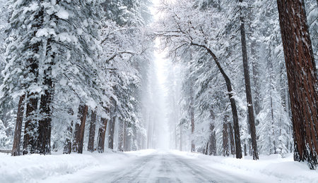 A path covered in snow winds through a dense forest, with towering trees creating a picturesque winter scene, Blizzard obscuring a forest landscape, AI Generated