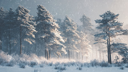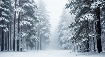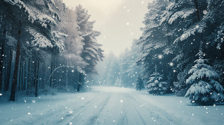 This snowy winter landscape features tall pine trees blanketed in snow, creating a tranquil and beautiful scene. Soft snowflakes fall gently, adding to the serene atmosphere.