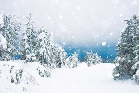 Winter landscape with snow covered trees in the forest. Christmas background.