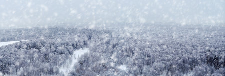 Panorama of a winter forest with white trees in the snow, copy space for text. Panoramic top view of the snowy park