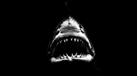 A striking black and white image of a shark with jaws wide open, showcasing its formidable teeth as it rises from the shadows of the ocean depths.
