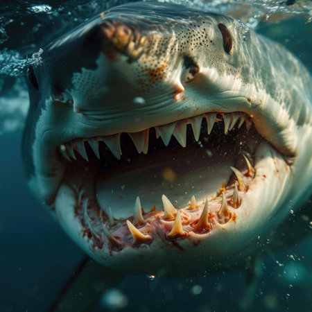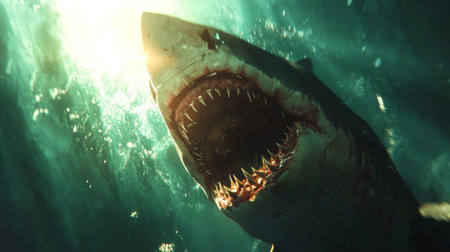 A dramatic shot of a shark's mouth wide open, with sharp teeth ready to bite down on its prey in the murky waters