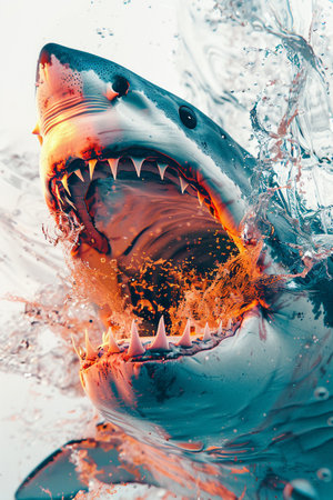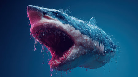 This photo showcases a vibrant and artistic representation of a shark, featuring a detailed open mouth and mesmerizing colors, perfect for creative projects.