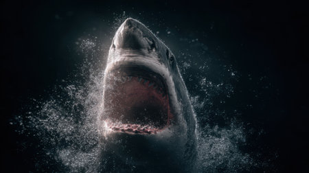 A stunning image of a shark breaching the water's surface, showcasing its powerful jaws and sharp teeth. This captivating scene captures the thrill of marine wildlife.