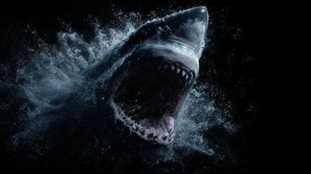 Ultra-detailed cinematic giant shark monster, open jaws mid-roar, water spray effect, isolated on black background