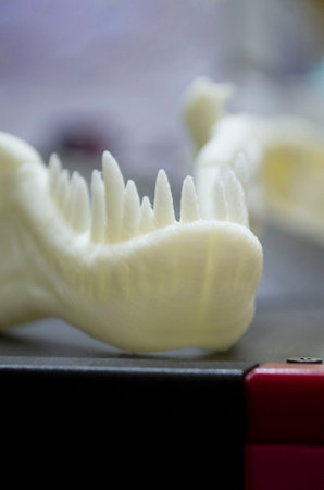 Art object printed on 3D printer. Prototype lower jaw with animal dinosaur skull teeth. Model printed on 3D printer from melted plastic close-up. Concept modern new innovation printing technology