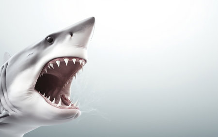 Great white shark with open mouth and teeth on gray background. 3D rendering