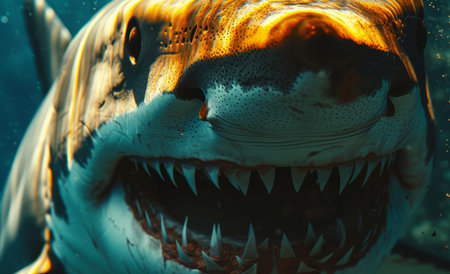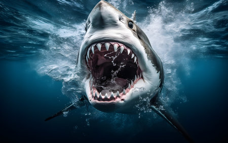 A stunning underwater depiction of a shark with its mouth wide open, showcasing its razor-sharp teeth. The image captures the beauty and power of this magnificent marine predator, highlighting the dynamic and elusive nature of sea life.
