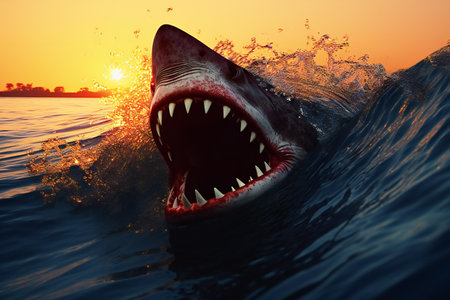 A menacing shark with glistening teeth breaks the water's surface, silhouetted against a fiery sunset sky, evoking power and wild oceanic beauty.