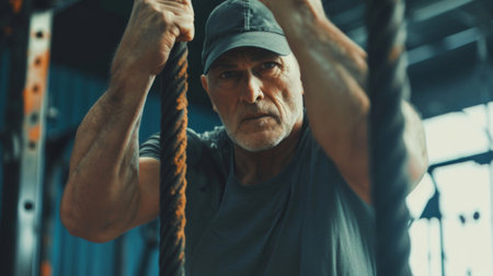 Close-up of a man's hands holding a rope in a gym.