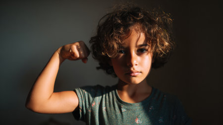 A child stands confidently, flexing their arm, showing casing determination and resilience while confronting bullying issues in a personal space.