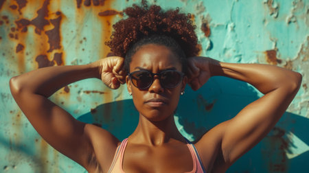 Empowered woman showcasing strength with a vibrant backdrop in a studio