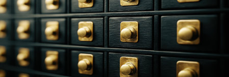 Rows of vintage safe deposit boxes with combination locks made of aged brass are lining a wall in a secure bank vault