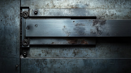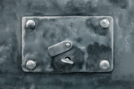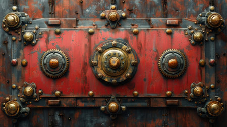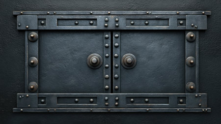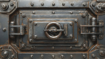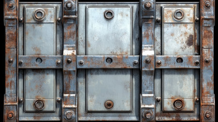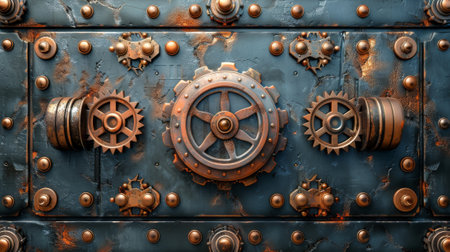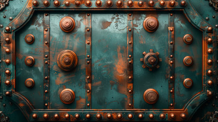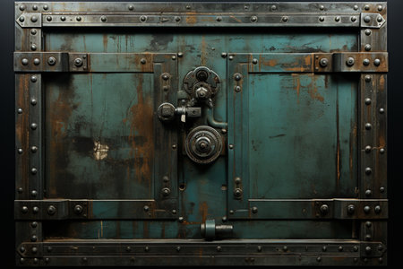 Aged industrial metal door background with heavy rivets and mechanical locks.